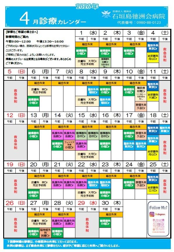石垣島徳洲会病院 外来受診の方はコチラ 入院に関しての情報はコチラ 介護医療院はコチラ 介護医療院専属の看護師急募↓ お知らせ・新着情報 2026年4月3日 NEW! 医療講演会 公開市民講座について 2026年4月1日 NEW! 診療待ち時間緩和のため「予約優先」を導入しています 2026年2月2日 令和8年6月より「院外処方せん」を発行する予定 2025年11月20日 マイナンバーカードの更新について 2025年11月12日 作業療法士(急募) 2025年11月5日 看護師・介護福祉士(急募)介護医療院 2025年10月7日 インフルエンザ予防接種 2025年4月1日 新院長あいさつ 2024年12月2日 介護医療院-開院 2024年7月2日 【2025年度:看護師募集】令和6年度石垣市島外看護師等誘致支援事業 ishigakijima.tokushukai 石垣島徳洲会病院(Instagram) 令和7年度、八重山地区への貢献が評価され、当院の院長が表彰を受けました。 地域の医療に向き合い続けて スタッフの休日in竹富島編🌺 八重山諸島のひとつ、竹富島は、 石垣島から船で15分ほどの小さな島です 2月に黒島で行われた牛まつりにて 研修医の尾村先生がなんと!!!! 牛の体重をピッタリ言い当て、商品 竹富町やまねこマラソン大会!part2!✌️ 日頃トレーニングしているスタッフも そうでないスタッフ 【1月〜2月の研修医の先生】 研修医の先生方ありがとうございました☺️✨ 3月から新しく加わった さらに読み込む Instagram でフォロー TEL:0980-88-0123患者さま専用ダイヤル 当院で「胃カメラ・大腸カメラ」を受ける患者様へ(動画説明) リクルートガイド 徳看マガジン